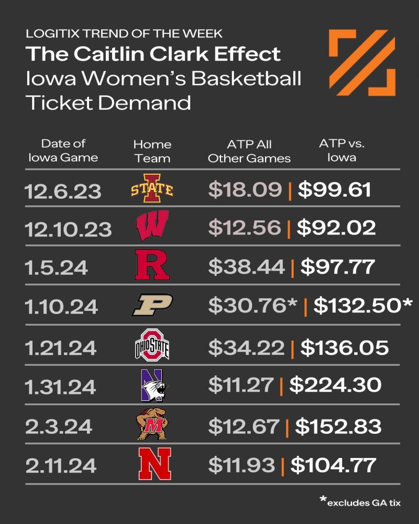 This past regular season away games for Iowa saw average ticket prices 20x higher than the average of their other home games. Logitix shared this post on LinkedIn and below graphic earlier this month: